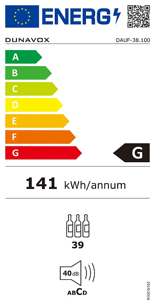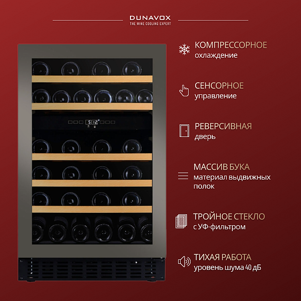 Тройное стекло с защитой от прямых УФ-лучей поддерживает качественные условия хранения вина. Встроенная система вентиляции создаёт необходимую циркуляцию воздуха для правильной работы винного холодильника. Компрессорный винный шкаф Dunavox DAUF-38.100DSS обладает большой вместимостью и способен разместить в себе до 38 бутылок. Располагаются они на выдвижных полках из массива бука.
