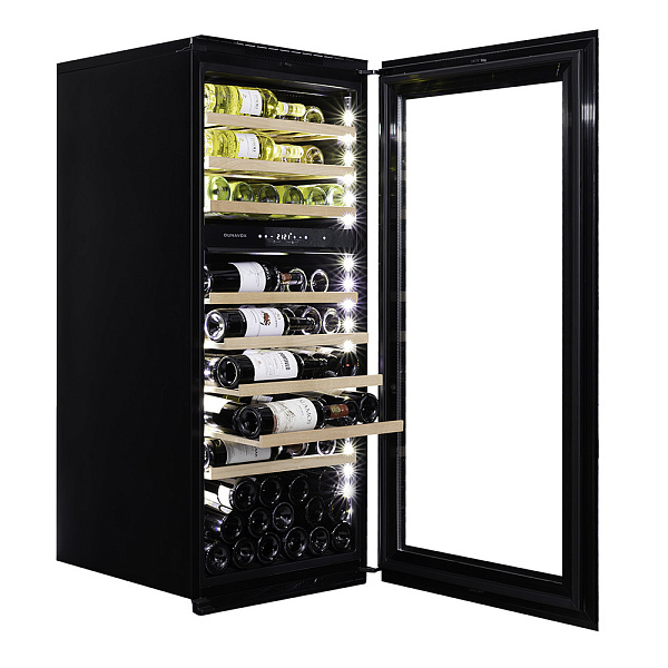 Лаконичный дизайн шкафа придаёт интерьеру современный вид. Чёрный корпус и рамка добавляют элегантности и солидности. В этой модели использовано панорамное освещение синего, янтарного и белого цвета, которое обеспечивает равномерную подсветку всех полок. (Освещение плавно включается при открывании дверцы, а через пару секунд после закрытия плавно гаснет.) Дополнительно у данной модели шкафа предусмотрен демонстрационный режим, во время которого освещение не гаснет. Такая функция помогает демонстрировать винную коллекцию Вашим друзьям и близким.