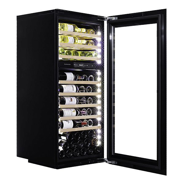 После установки у данного винного шкафа сохраняется функция Touch Open. Дверца открывается во время прикосновения Вашей руки к стеклу. При необходимости можно установить ручку из нержавеющей стали и настроить чувствительность сенсора. В качестве дополнительной функции, производители Dunavox разработали реверсивную дверь. Это поможет разместить шкаф в удобном для Вас месте или расположить две модели рядом, создав технологию открытия side-by-side.Двойное стекло с защитой от прямых УФ-лучей поддерживает качественные условия хранения вина. Встроенная система вентиляции создаёт необходимую циркуляцию воздуха для правильной работы винного холодильника