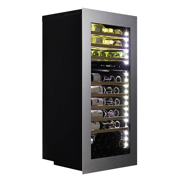 Лаконичный дизайн шкафа придаёт интерьеру современный вид. Чёрный корпус и рамка из бесшовной нержавеющей стали добавляют элегантности и солидности. В этой модели использовано панорамное освещение синего, янтарного и белого цвета, которое обеспечивает равномерную подсветку всех полок. (Освещение плавно включается при открывании дверцы, а через пару секунд после закрытия плавно гаснет.) Дополнительно у данной модели шкафа предусмотрен демонстрационный режим, во время которого освещение не гаснет. Такая функция помогает демонстрировать винную коллекцию Вашим друзьям и близким.