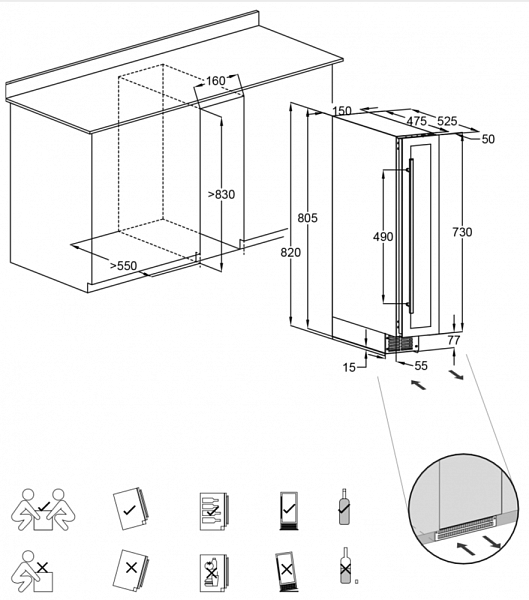 Одна камера в технике такого типа встречается чаще всего, потому что в ней просто расположить все функциональные детали, и в итоге прибор действительно похож на обычный шкаф. Охлажденный воздух поступает внутрь благодаря компрессору. Размораживается автоматически, поэтому не нужно вручную удалять иней со стенок и поддерживать тем самым оптимальные условия. Общий диапазон температур, которые можно установить: 5-20 градусов. Средняя влажность воздуха (в процентах), которая поддерживается, чтобы пробки в бутылках не пересыхали: 60-80.