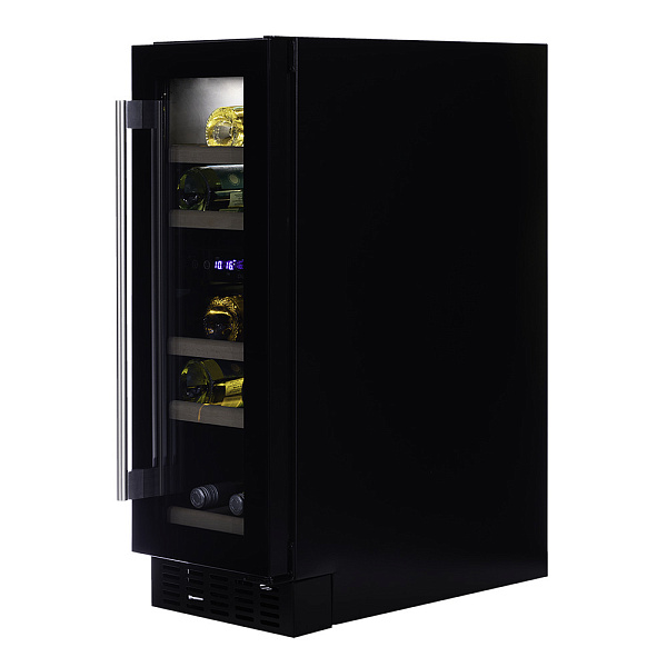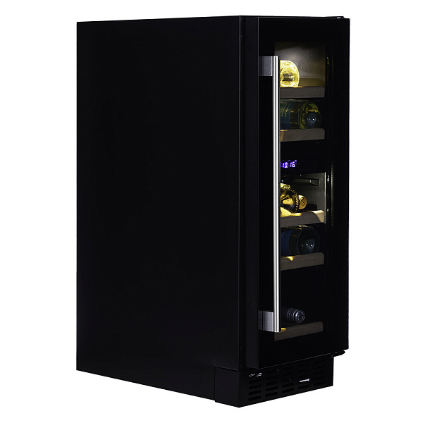 Лаконичный дизайн шкафа придаёт интерьеру современный вид. Чёрный корпус и рамка добавляют элегантности и солидности. В этой модели использовано освещение синего цвета, которое обеспечивает равномерную подсветку всех полок. (Освещение плавно включается при открывании дверцы, а через пару секунд после закрытия плавно гаснет.) Дополнительно у данной модели шкафа предусмотрен демонстрационный режим, во время которого освещение не гаснет. Такая функция помогает демонстрировать винную коллекцию Вашим друзьям и близким.