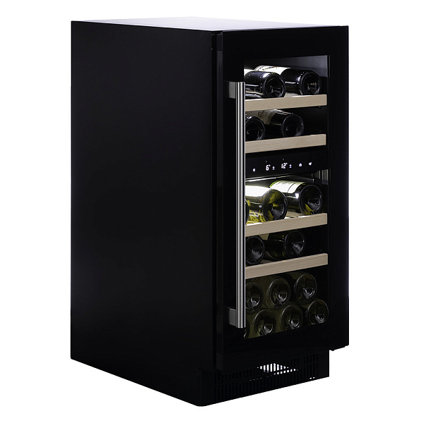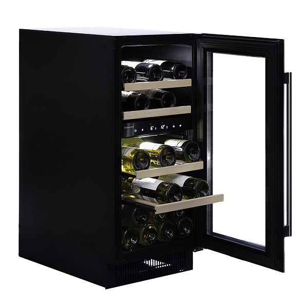 Лаконичный дизайн шкафа придаёт интерьеру современный вид. Чёрный корпус и рамка добавляют элегантности и солидности. В этой модели использовано освещение синего цвета, которое обеспечивает равномерную подсветку всех полок. (Освещение плавно включается при открывании дверцы, а через пару секунд после закрытия плавно гаснет.) Дополнительно у данной модели шкафа предусмотрен демонстрационный режим, во время которого освещение не гаснет. Такая функция помогает демонстрировать винную коллекцию Вашим друзьям и близким.