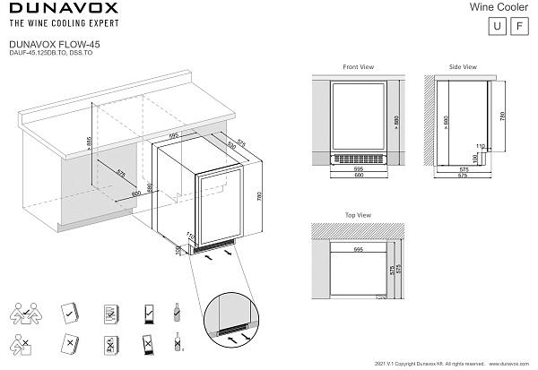 Винный шкаф DAUF-45.125DB.TO входит в серию «FLOW». В линейке представлено оборудование премиум-класса шириной, соответствующей стандартным кухонным модулям, оснащены съемной вентиляционной решеткой, которая находится в нижней части корпуса. Они как устанавливаются под столешницу, так и используются как отдельностоящие устройства. В серию входят модели различных вариациях: со стандартными и скрытыми ручками, а также с инновационной технологией push-to-open (открытие одним нажатием).