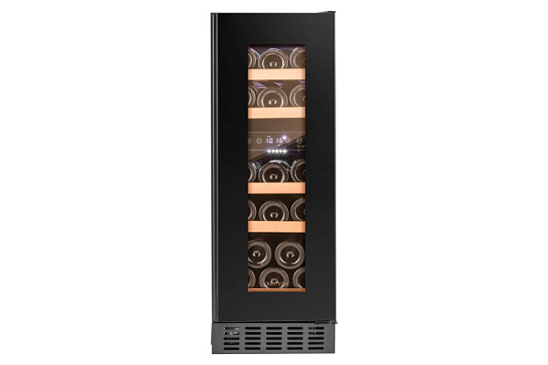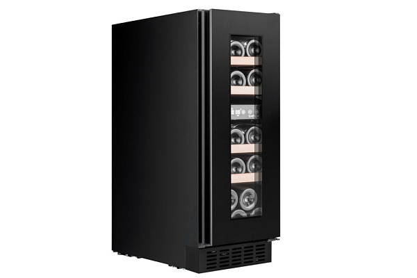 Стильный дизайн с дверцей из чёрного стекла и интегрированной ручкой, полками из бука и светодиодной подсветкой белого цвета. Сенсорная панель панель управления с индикатором температуры.