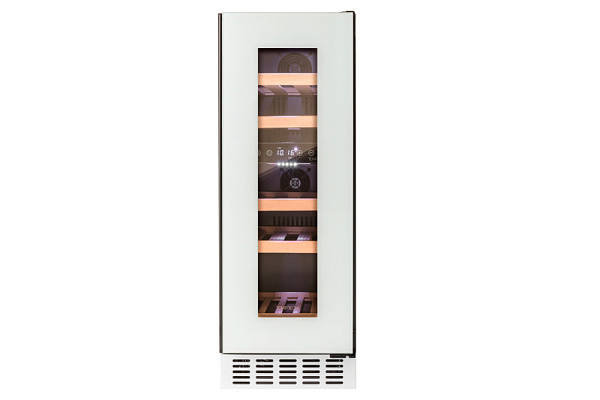 Стильный дизайн с дверцей из стекла белого цвета с интегрированной ручкой, полками из бука и белой светодиодной подсветкой. Сенсорная панель управления с индикатором температуры.
