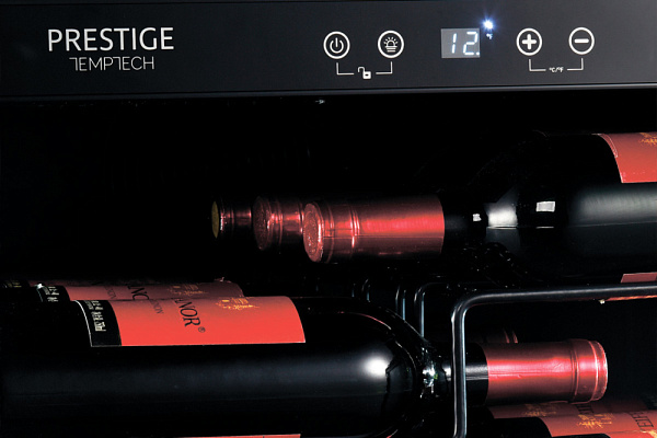 Дверца шкафа Temptech PRESPROX60SRB с трёхслойным стеклом и УФ-фильтром защищает вино от вредных ультрафиолетовых лучей и тепла, которые могут проникнуть внутрь холодильника.