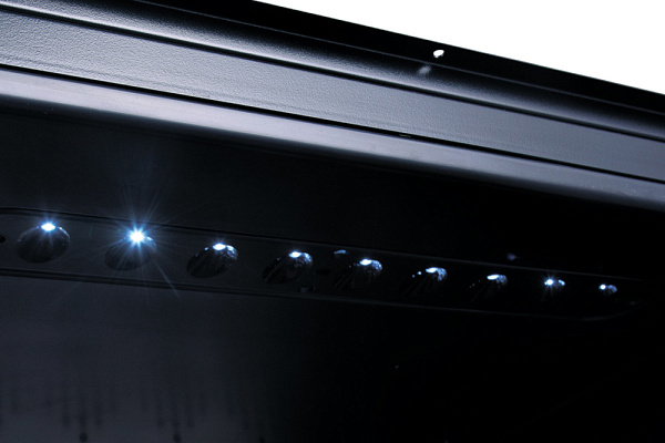 Стильный дизайн с чёрной стеклянной передней панелью, выдвижными полками из бука и белой внутренней светодиодной подсветкой.