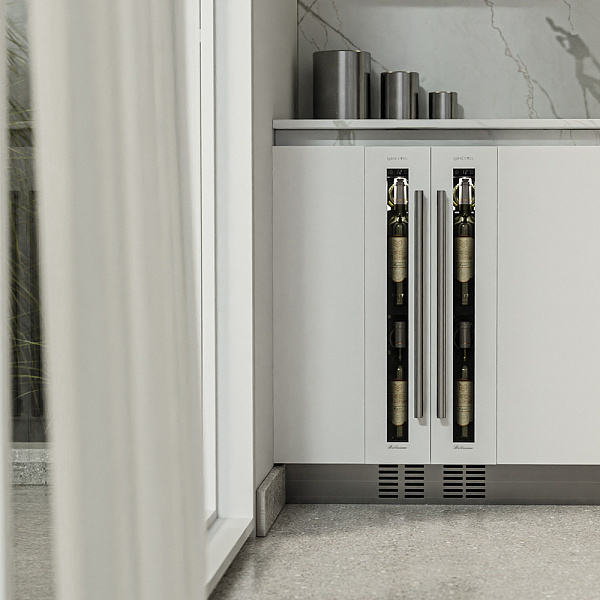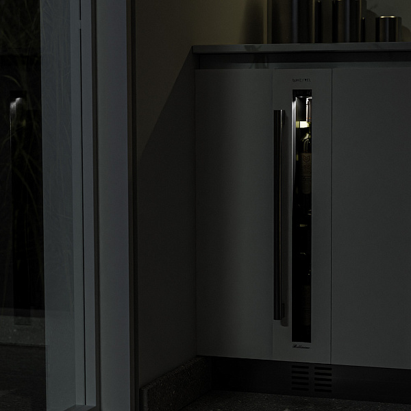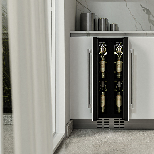 - необходимо установить винный шкаф по уровню и отрегулировать зазоры между дверью и мебельным фасадом, чтобы не повредить их.