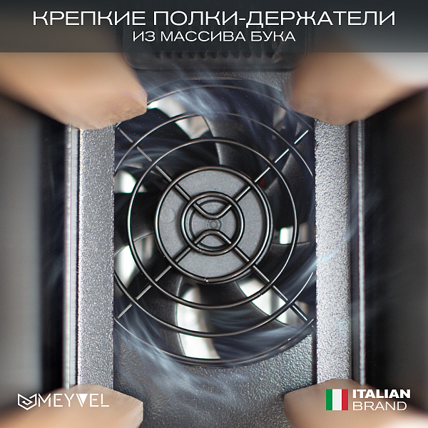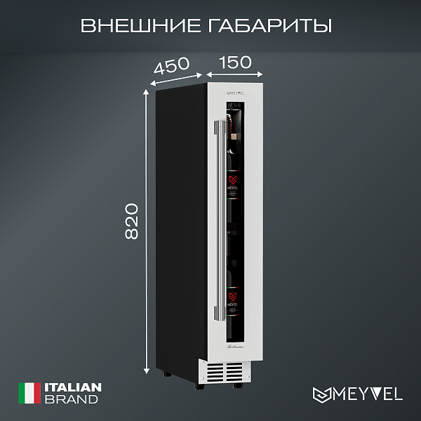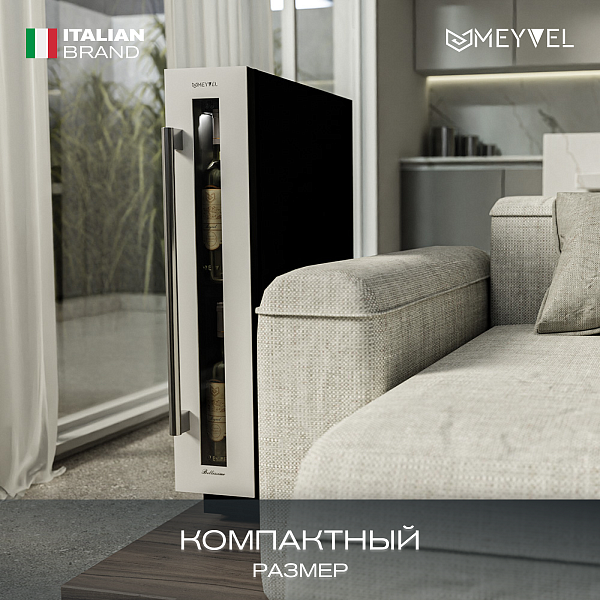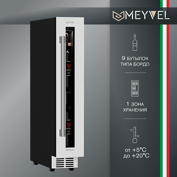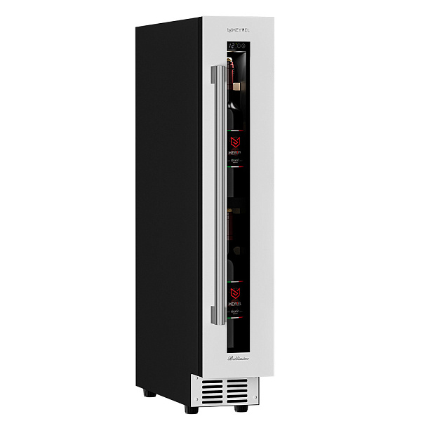Компрессорный винный шкаф Meyvel MV9-KWT1 несмотря на небольшой размер, обладает большой вместимостью и дает возможность разместить до 9 бутылок. Располагаются они на держателях из массива бука. Внутреннее пространство шкафа поддерживает комфортную для вина температуру от +5℃ до +20℃ и имеет самую большую вместимость среди аналогичных винных шкафов. Преимуществом этой модели является возможность разместить внутри одну высокую бутылку. Так же, MV9-KWT1 данная модель поддерживает влажность в диапазоне 60-80%, как в настоящем винном погребе.