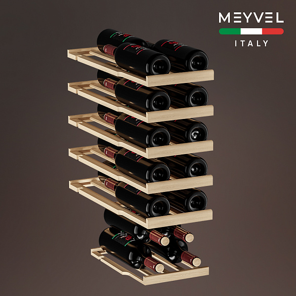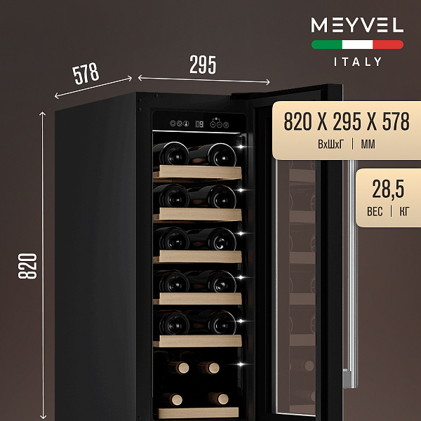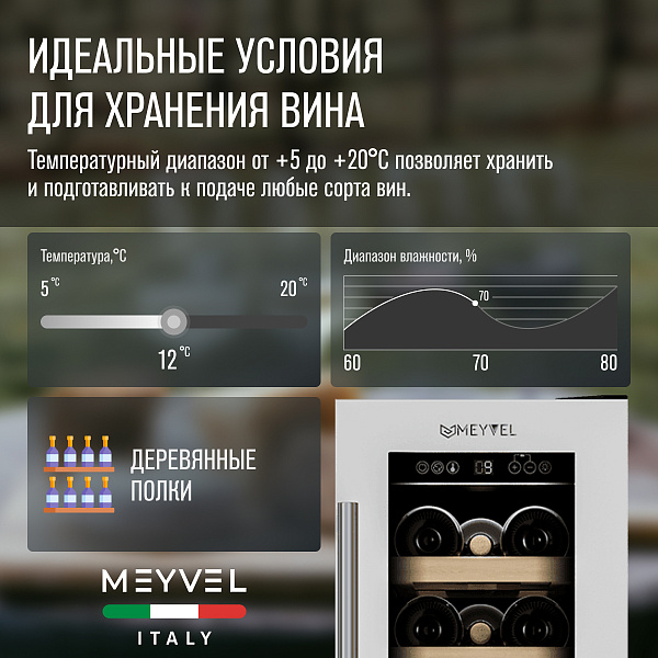 Компрессорный винный шкаф Meyvel MV19-KWT1 обладает оптимальной вместимостью и даёт возможность разместить до 19 бутылок стандартного типа Бордо (0,75 л). Располагаются они на выдвижных полках из дерева. Внутреннее пространство шкафа поддерживает комфортную для вина температуру от +5°C до +20°C. Так же, эта модель поддерживает влажность в диапазоне 60-80%, как в настоящем винном погребе.