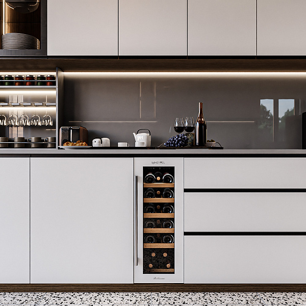 - необходимо установить винный шкаф по уровню и отрегулировать зазоры между дверью и мебельным фасадом, чтобы не повредить их.