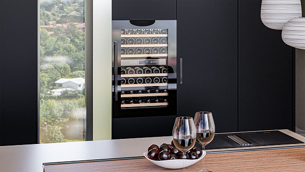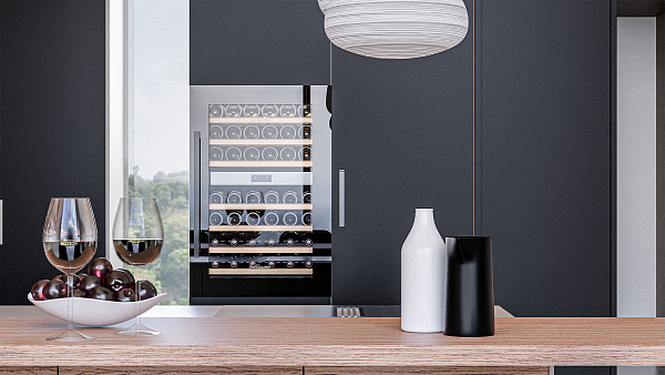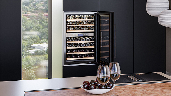 - необходимо установить винный шкаф по уровню и отрегулировать зазоры между дверью и мебельными фасадами, чтобы не повредить их.