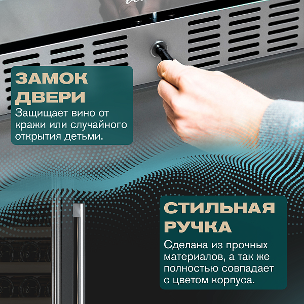 Модель MV116-KST2 имеет привлекательный внешний вид, сочетающий в себе неподвластное времени очарование натуральных материалов с высокотехнологичными системами сохранения продуктов. Винный холодильник Meyvel MV116-KST2 оснащен дверью с защитой от ультрафиолетовых лучей и отлично подойдет для хранения и созревания различных сортов вин. Динамическая система охлаждения обеспечивает оптимальную температуру для вина и сохраняет необходимую влажность внутри камеры.
