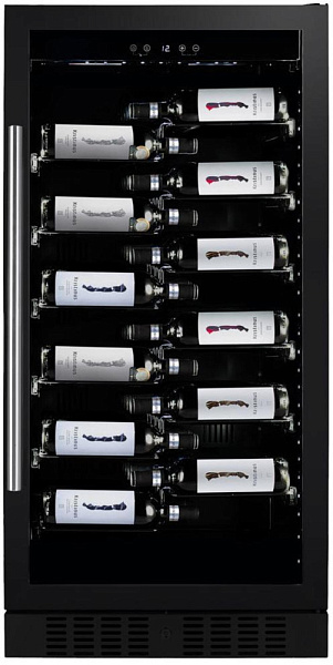 Стеклянная дверь — дополнительный изящный штрих к общему дизайну модели. Специальное покрытие защищает вино от влияния ультрафиолетовых лучей, которые проникают, если шкаф находится в солнечной комнате. Цвет корпуса — черный. Дверь можно перевесить на другую сторону, поэтому вариантов размещения его в доме с