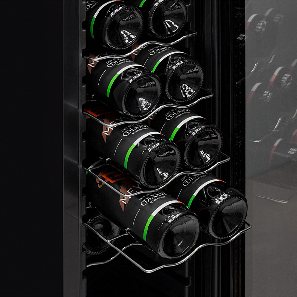 Шкаф имеет в комплекте 5 металлических полок и одну демонстрационную полку, которая позволить сразу же обращать внимание на этикетку нужных вам сортов вина. Общая вместимостью до 12 бутылок типа "Бордо". Полки выполнены из хромированного металла, что обеспечивает их прочность.