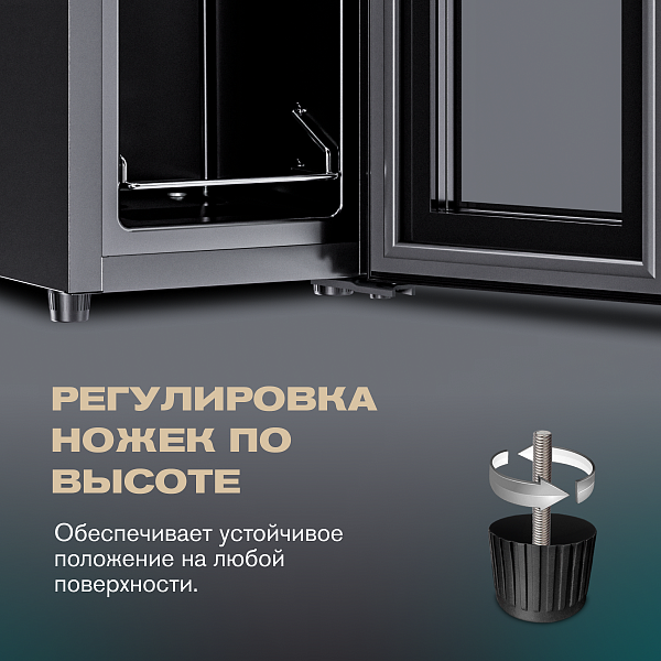 - после установки винного шкафа необходимо проверить, насколько ровно Вы настроили ножки, так как использование винного шкафа, установленного под углом, может привести к поломке дверцы и повышенному шуму при работе.