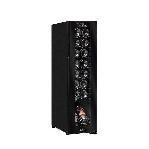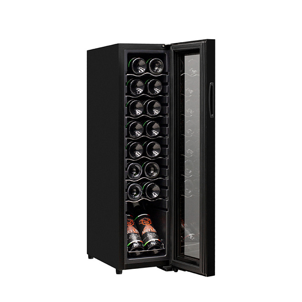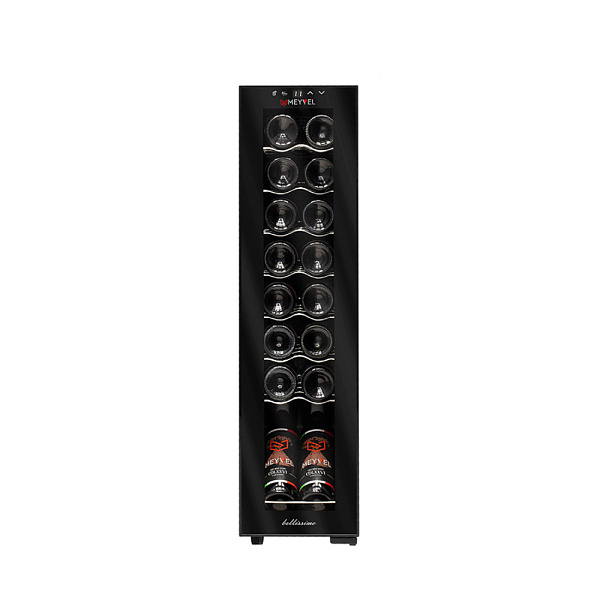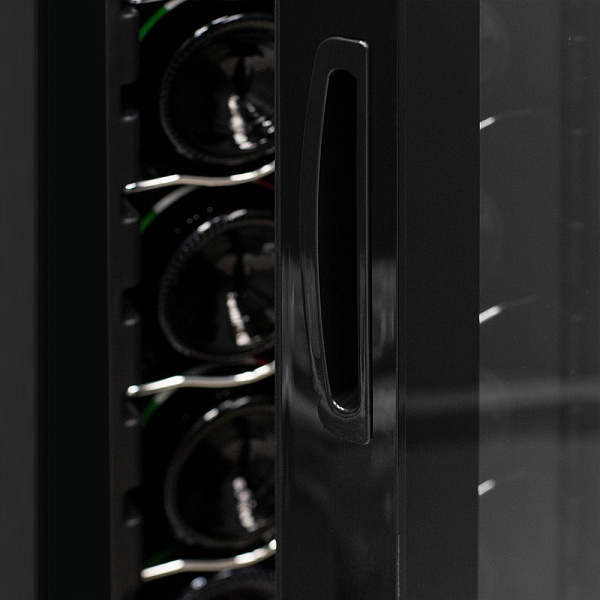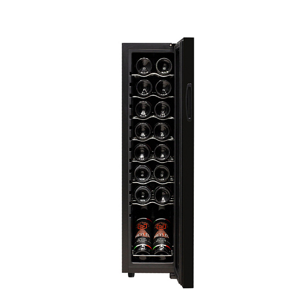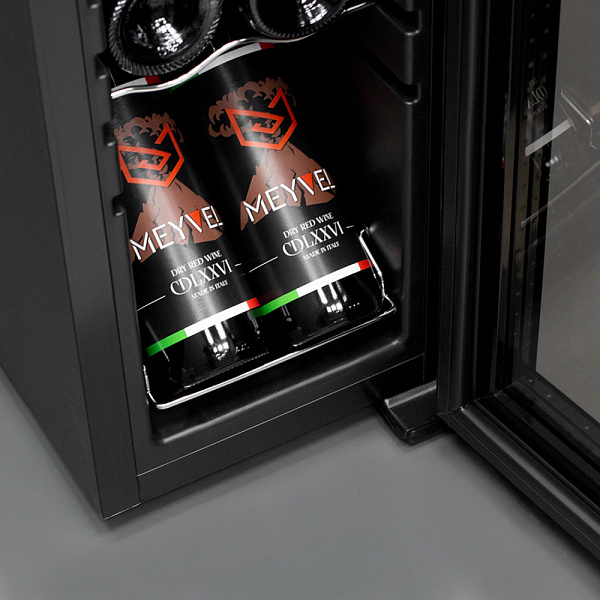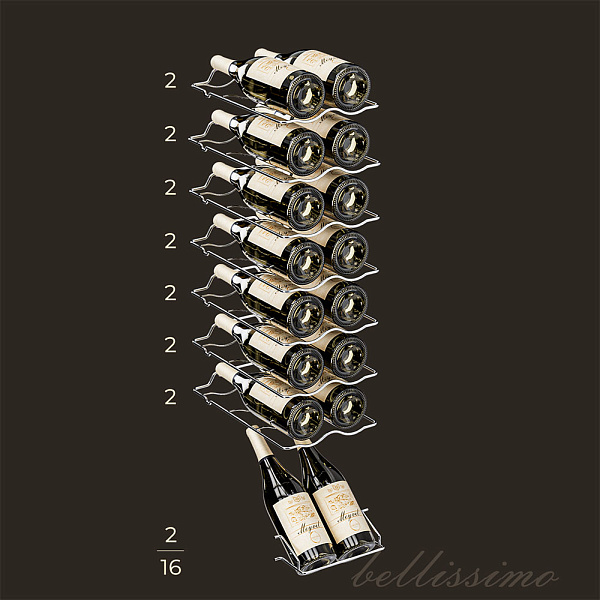 Шкаф имеет в комплекте 7 металлических полок и одну демонстрационную полку, которая позволить сразу же обращать внимание на этикетку нужных вам сортов вина. Общая вместимостью до 16 бутылок типа "Бордо". Полки выполнены из хромированного металла, что обеспечивает их прочность.