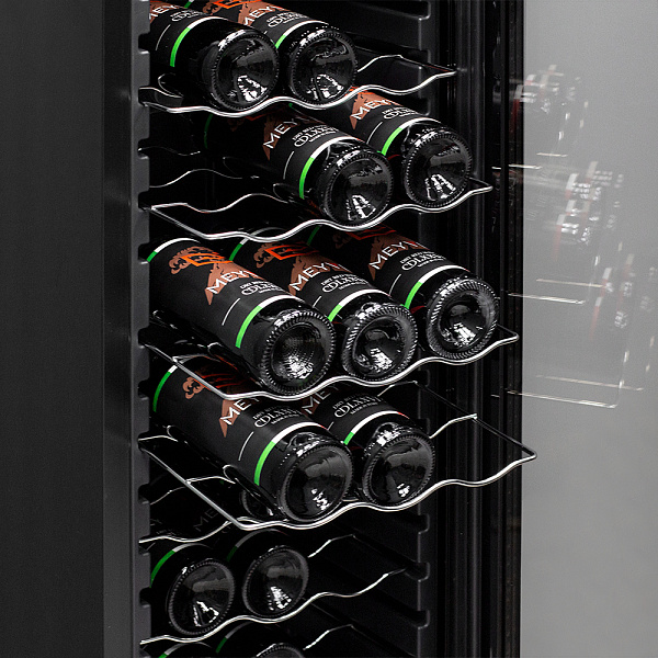 Шкаф имеет в комплекте 8 металлических полок и одну демонстрационную полку, которая позволить сразу же обращать внимание на этикетку нужных вам сортов вина. Общая вместимостью до 27 бутылок типа "Бордо". Полки выполнены из хромированного металла, что обеспечивает их прочность.