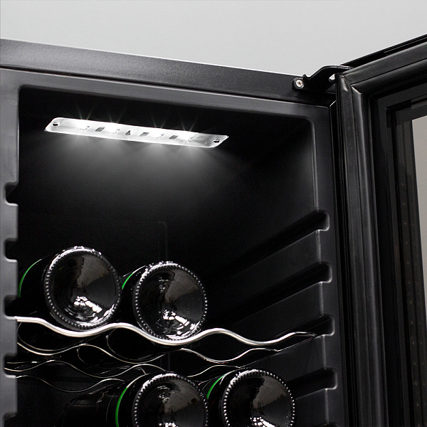 С помощью сенсорной панели управления вы можете настроить внутреннюю температуру от +5C° до +18C°, так же в случае необходимости, вы можете включить внутреннее освещение. Сенсорная панель имеет функцию блокировки, чтобы избежать случайных нажатий.