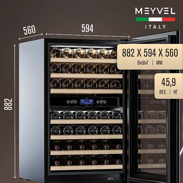 Meyvel MV42-KSB2 поддерживает оптимальную температуру и влажность воздуха, а также изолирует вина от воздействия солнечных лучей. MV42-KSB2 отлично подходит для созревания и хранения вина, так как имеет две температурные зоны: диапазон верхней от +5°C до +10°C, а нижней - от +10°C до +18°C.