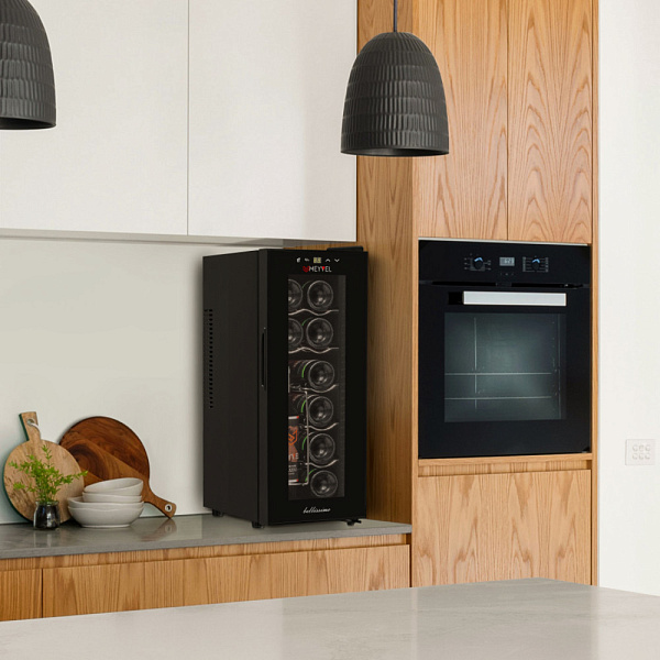 Термоэлектрический винный шкаф Meyvel MV12-TBD1 обладает небольшой вместимостью и способен разместить в себе до 12 бутылок. Управление осуществляется с помощью интуитивно-понятной сенсорной панели. Внутреннее пространство шкафа имеет одну температурную зону с возможностью настраивать её в диапазоне от +10 °C до +18°C. Электронный термостат помогает стабильно поддерживать заданную Вами температуру. Внутренняя влажность держится в диапазоне 60-80%. Перечисленные особенности создают условия хранения, которые надолго сохранять вкусовые качества вашей винной коллекции. Дополнительно у данной модели шкафа предусмотрен демон