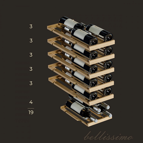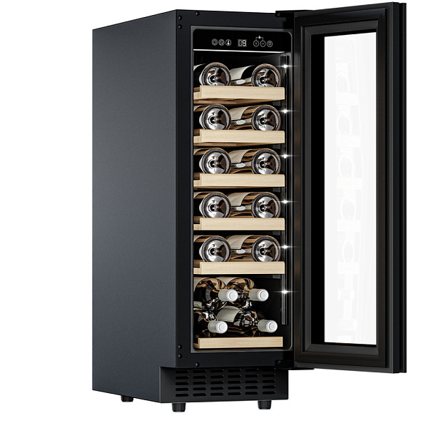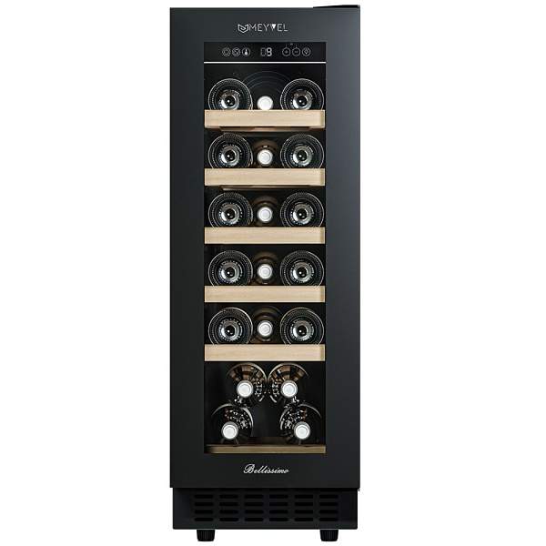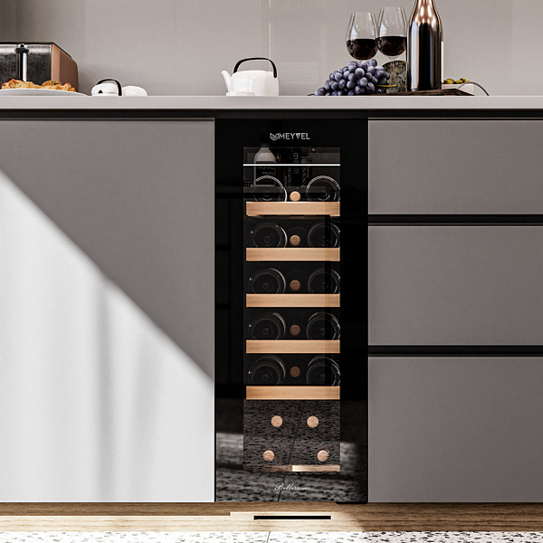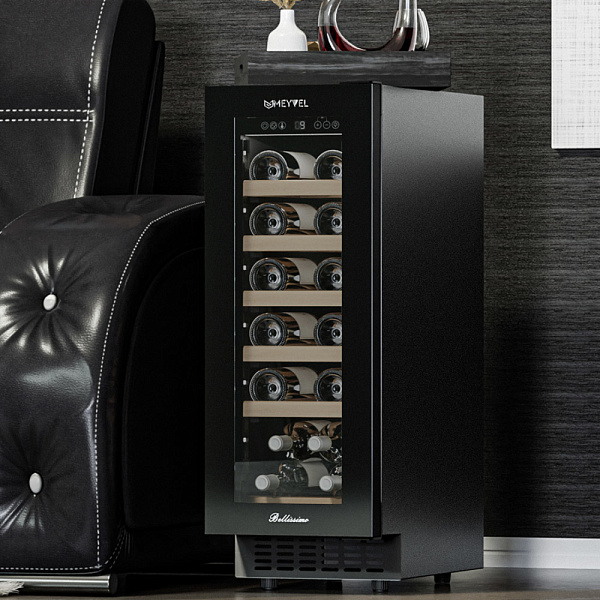 Компрессорный винный шкаф Meyvel MV19NH-KBT1 обладает оптимальной вместимостью и даёт возможность разместить до 19 бутылок стандартного типа Бордо (0,75 л). Располагаются они на выдвижных полках из дерева. Внутреннее пространство шкафа поддерживает комфортную для вина температуру от +5°C до +20°C. Так же, эта модель поддерживает влажность в диапазоне 60-80%, как в настоящем винном погребе.