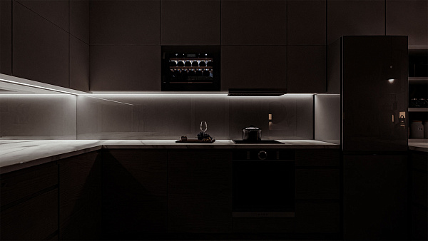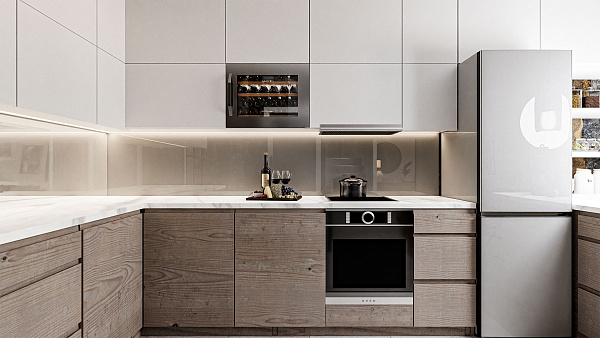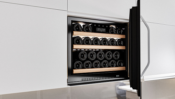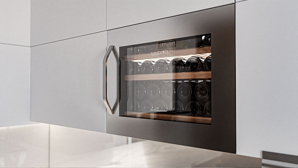 - необходимо установить винный шкаф по уровню и отрегулировать зазоры между дверью и мебельными фасадами, чтобы не повредить их.