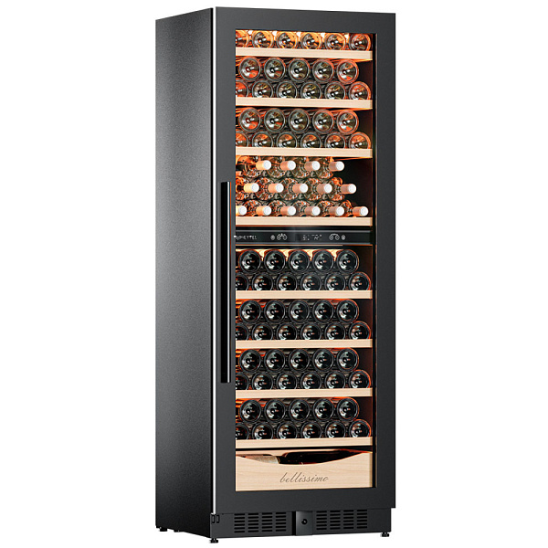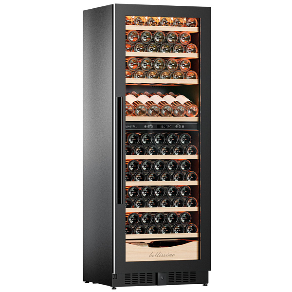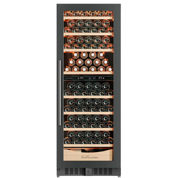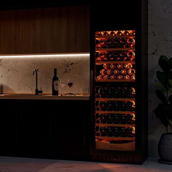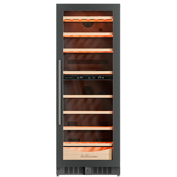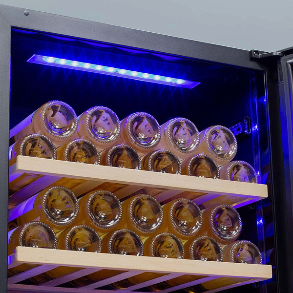 Несомненно, Вас порадует наличие панорамного светодиодного освещения (подсвечивает каждую полку), которое имеет три цвета - белый, янтарный и синий. Оно не выделяет тепло и следовательно - не нагревает бутылки с вином. Так что Вы сможете эффектно демонстрировать Вашу винную коллекцию.