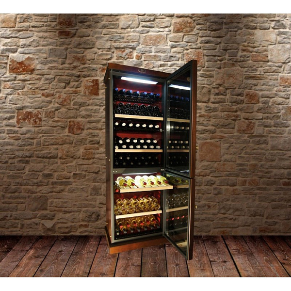 Модель оснащена статической системой охлаждения на базе компрессора SECOP (Danfoss), которая кроме охлаждения вина еще и сохраняет оптимальную влажность внутри камеры. Комплектуется шкаф девятью деревянными полками.