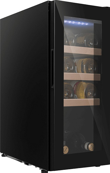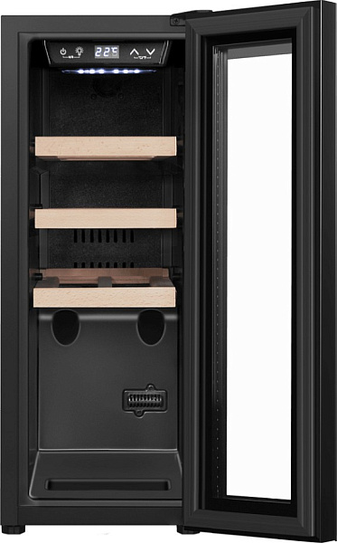Внутреннее пространство шкафа освещено светодиодными лампами, что позволяет удобно размещать и выбирать бутылки. Полки из натурального бука не только подчеркивают эстетику дизайна, но и обеспечивают надежное хранение бутылок. В шкафу предусмотрена одна температурная зона, что позволяет поддерживать оптимальные условия для хранения вина.