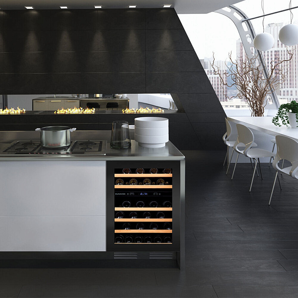 Двухзонная модель на 46 бутылок встраиваемого или отдельностоящего типа. Ее можно разместить под столешницу, гармонично интегрировав в кухонный гарнитур, или в любой другой точке помещения без привязки к мебели. Элегантный внешний вид и ЖК-дисплей. Устройство идеально подходит для современных кухонных помещений, прекрасно вписываясь в любой интерьер, будто то классика или минимализм.