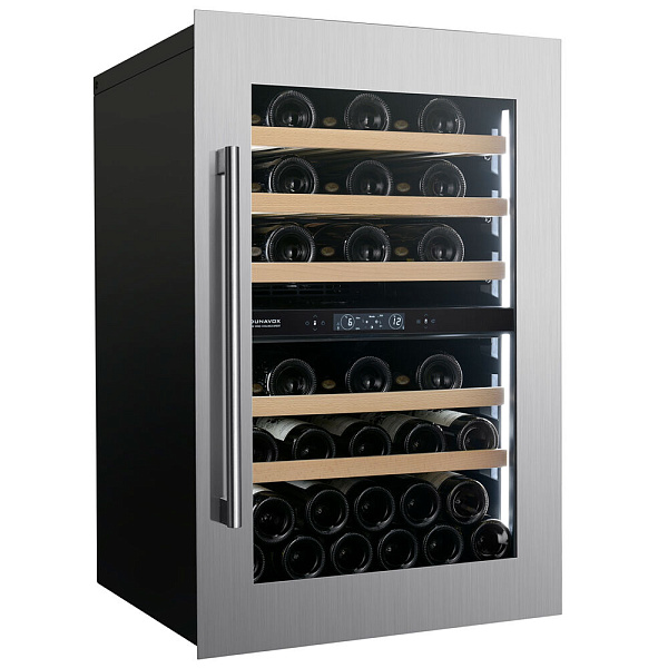 Изысканная модель Dunavox DVS-44.120DSS вместимостью 44 бутылки с ЖК-экраном. Встраивается в колонну, полноценно вливаясь в кухонный гарнитур.