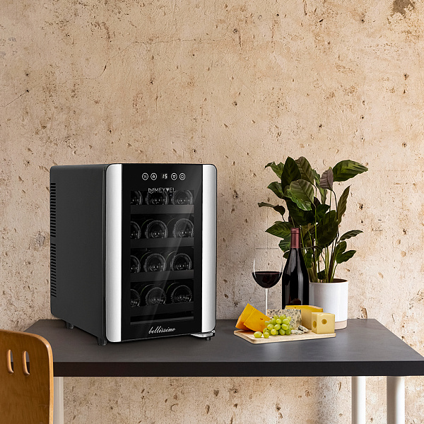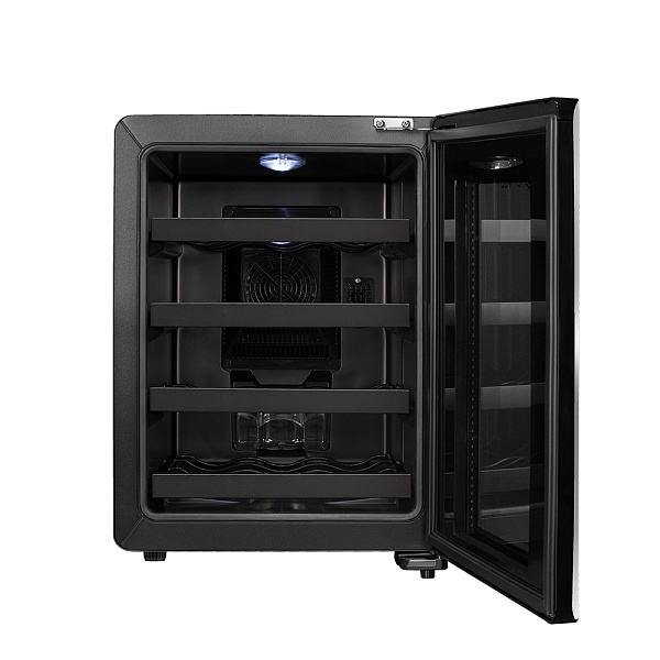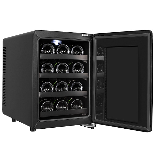 Двойное стекло с защитой от прямых УФ-лучей поддерживает качественные условия хранения вина. Для размещения винных бутылок, шкаф оснащен 4 полками из хромированного металла.
