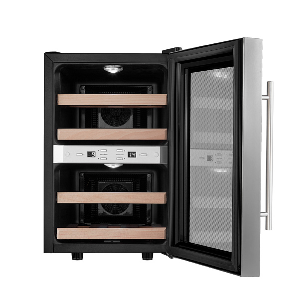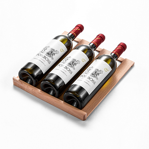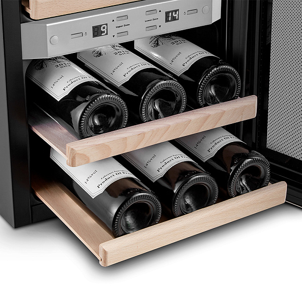 Для размещения винных бутылок, шкаф оснащен 4 крепкими полками из массива бука. Винные бутылки, расположенные внутри шкафа, надёжно защищены от вредоносных ультрафиолетовых лучей двойным стеклом, установленным в дверцу. В нижней части винного шкафа установлен съемный резервуар для воды, который предназначен для эффективного поддержания уровня влажности.