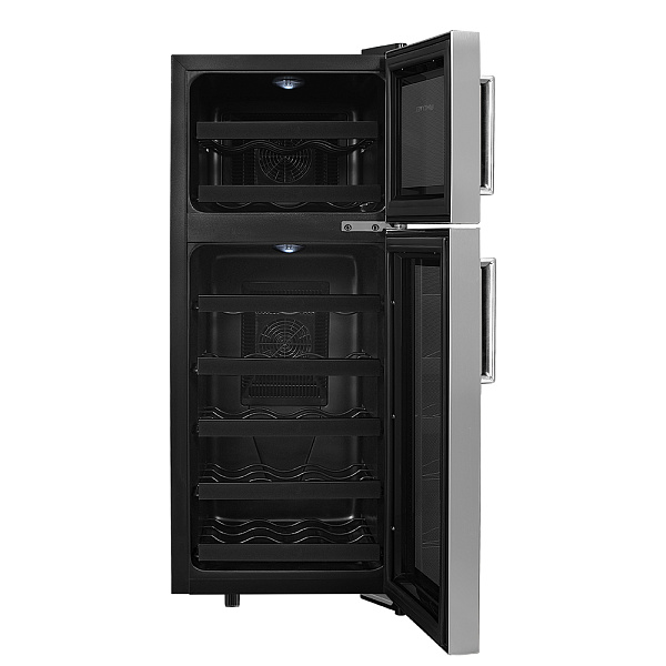 Термоэлектрический винный шкаф имеет две температурные зоны, храните красные и белые вина в одном месте! Данная модель поддерживает необходимый для хранения вин уровень влажности в 50-80%.