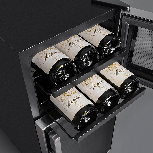 Двойное стекло с защитой от прямых УФ-лучей поддерживает качественные условия хранения вина. Для размещения винных бутылок, шкаф оснащен 7 полками из металла.