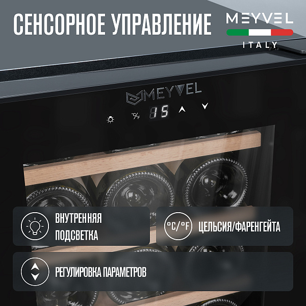 Сенсорное управление позволяет легко установить и поддерживать нужную температуру и влажность. LED-подсветка придает шкафу презентабельный вид и облегчает доступ к его содержимому.