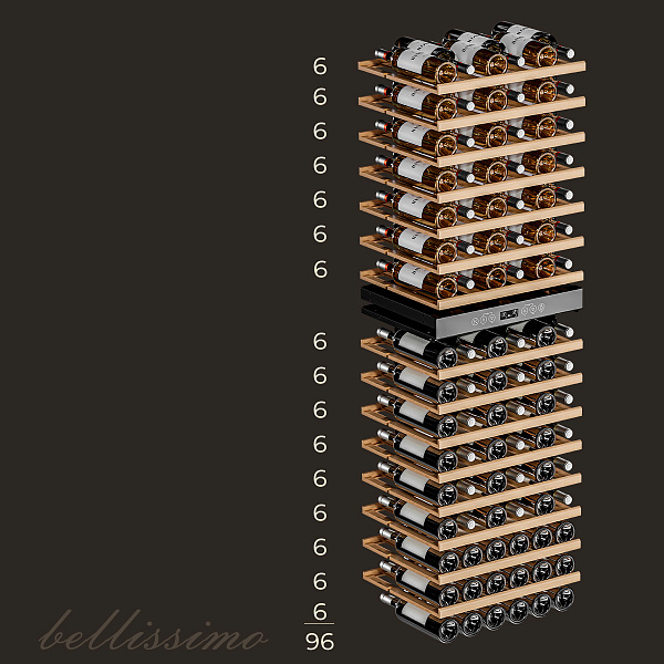 Компрессорный винный шкаф Meyvel MV83-KBB2 обладает большой вместимостью и способен разместить до 96 бутылок. Располагаются они на полках из массива бука. Внутреннее пространство шкафа разделено на 2 температурные зоны с возможностью настраивать каждую из них. Общий температурный диапазон от +5°C до +18°C. Холодильник поддерживает влажность в диапазоне 60-80%, как в настоящем винном погребе.