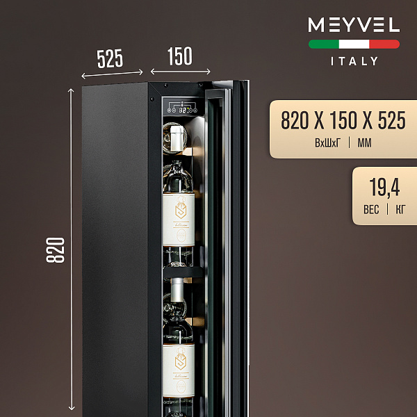 Компрессорный винный шкаф Meyvel MV9NH-KWT1 несмотря на небольшой размер, обладает большой вместимостью и дает возможность разместить до 9 бутылок. Располагаются они на держателях из массива бука. Внутреннее пространство шкафа поддерживает комфортную для вина температуру от +5℃ до +20℃ и имеет самую большую вместимость среди аналогичных винных шкафов. Преимуществом этой модели является возможность разместить внутри одну высокую бутылку. Так же, MV9NH-KWT1 данная модель поддерживает влажность в диапазоне 60-80%, как в настоящем винном погребе.
