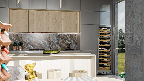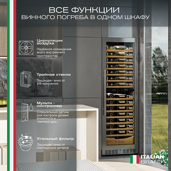 Винный шкаф предназначен для профессионального и длительного хранения различных сортов вин (до 110 бутылок типа Бордо). Он так же оснащен дверью с защитой от ультрафиолетовых лучей и поддерживает влажность в диапазоне 60-80%, как в настоящем винном погребе.