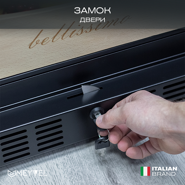 Винный холодильник оснащён надёжным и экономичным компрессором. Ручка, вентиляционная решётка и замок выполнены в цвете корпуса.