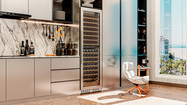 Винный холодильник оснащён надёжным и экономичным компрессором. Ручка, вентиляционная решётка и замок выполнены в цвете корпуса.