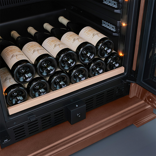 Полки выполнены из массива бука. Этот натуральный и крепкий материал не только имеет красивую текстуру, но и прекрасно гасит небольшую вибрацию. Так что Ваше вино будет храниться в абсолютном покое.