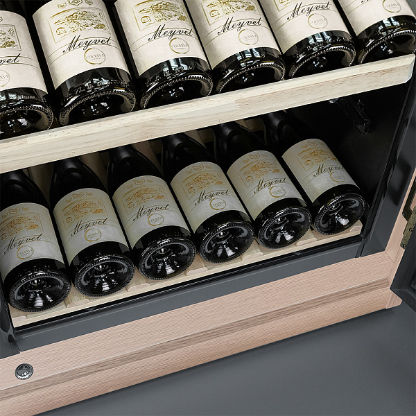 Светодиодное освещение обеспечивает равномерное освещение всего пространства шкафа, позволяя с легкостью выбрать нужную бутылку. А возможность устранения запотевания стекла предотвращает образование конденсата и сохраняет качество вина. Демонстрационные полки делают содержание вина не только удобным, но и презентабельным - вы сможете выставлять лучшие вина коллекции.