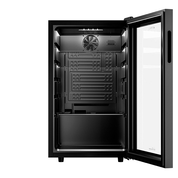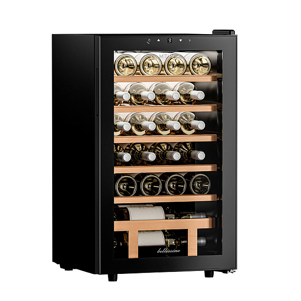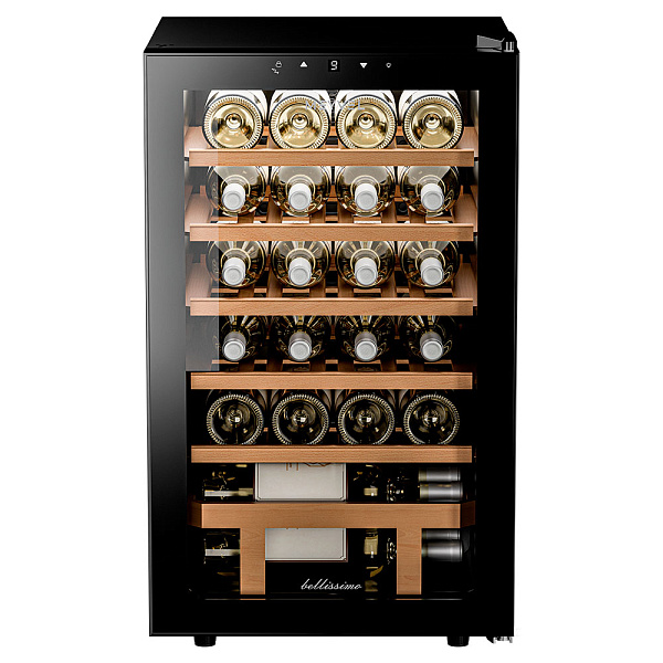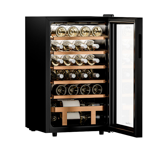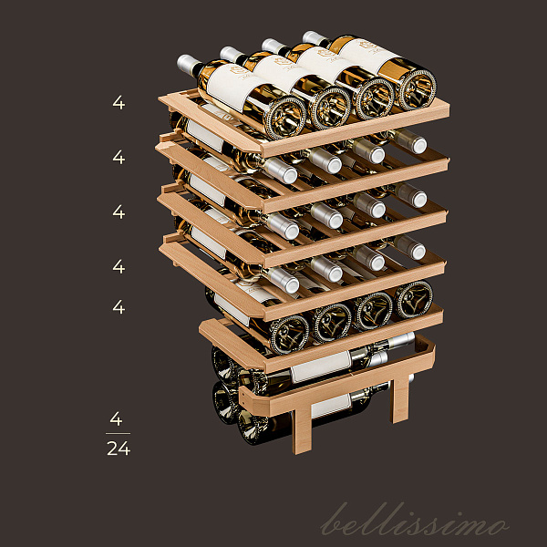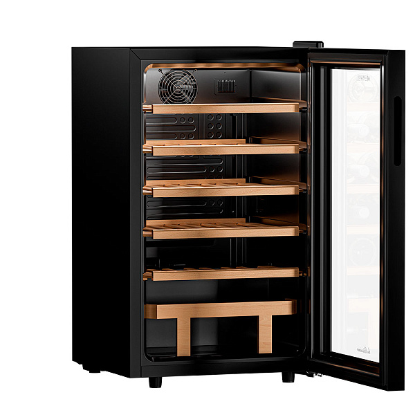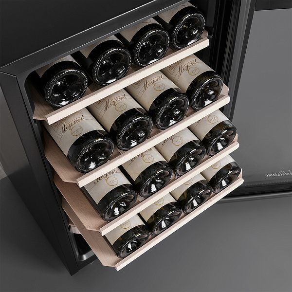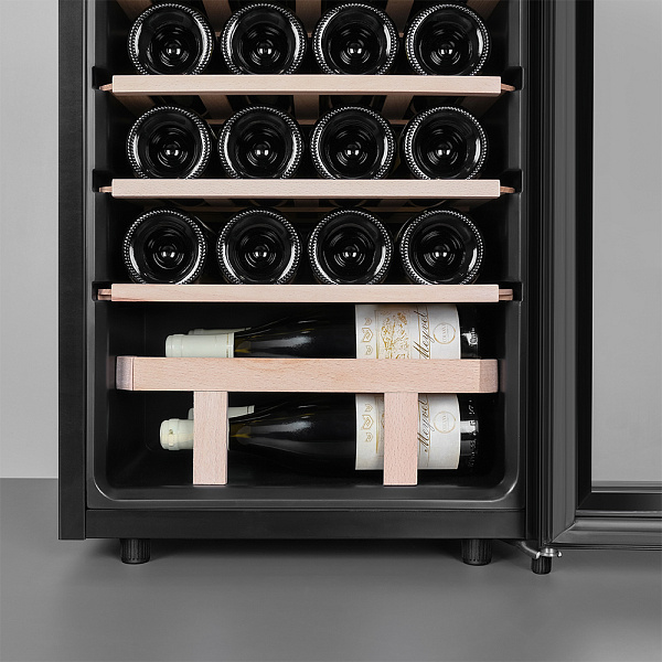5 выдвижных полок из бука обеспечат удобный доступ к содержимому, на полке для нестандартных бутылок с увеличенным пространством можно разместить шампанское. Кроме этого, в шкафу можно располагать бутылки стоя, что удобно для хранения уже открытого вина.
