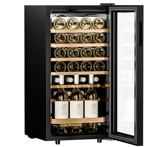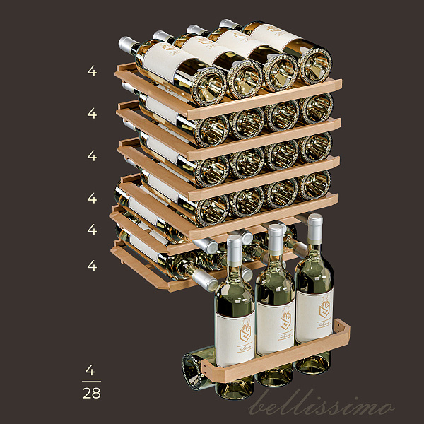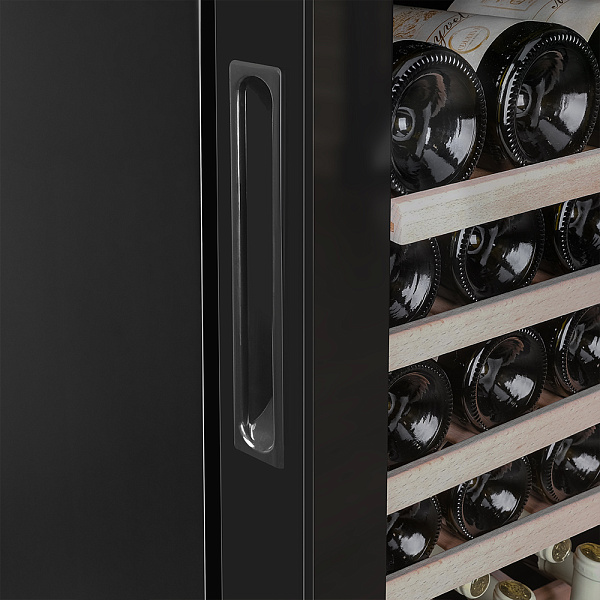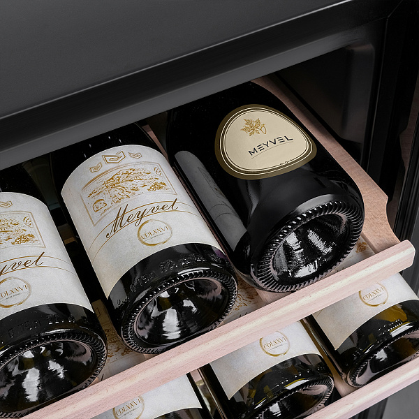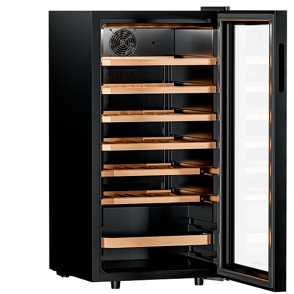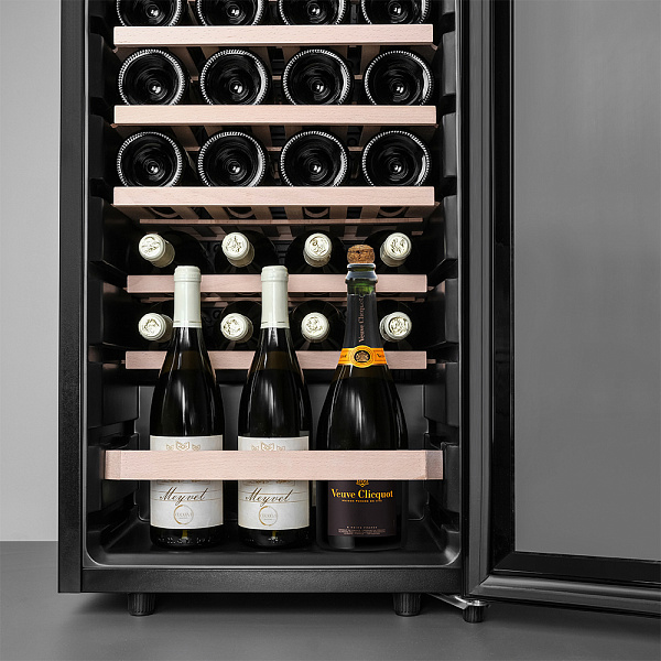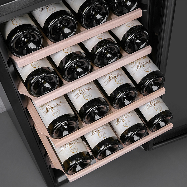 6 выдвижных полок из бука обеспечат удобный доступ к содержимому, на полке для нестандартных бутылок с увеличенным пространством можно разместить шампанское. Кроме этого, в шкафу можно располагать бутылки стоя, что удобно для хранения уже открытого вина.