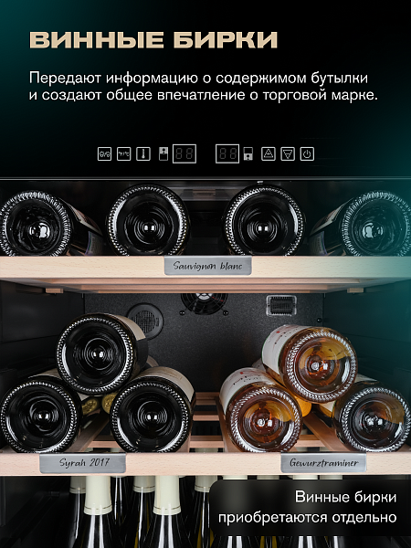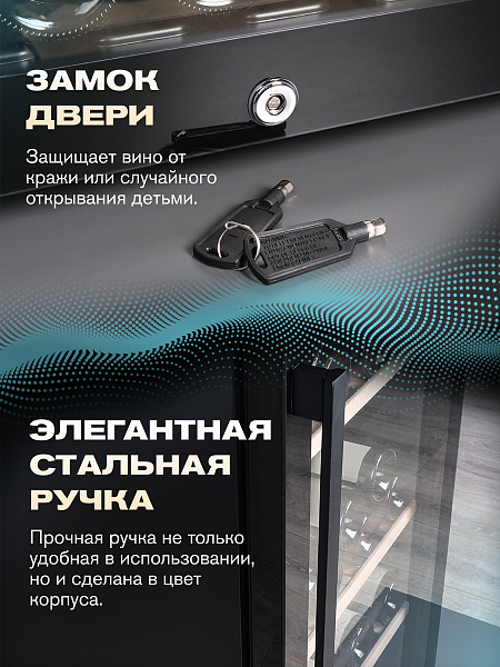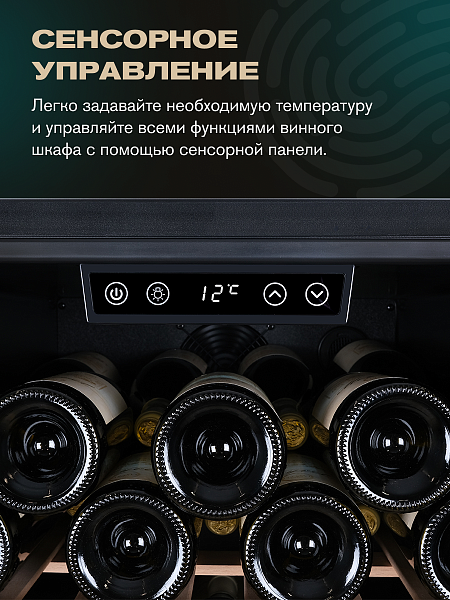 Управление осуществляется через сенсорную панель, а настройка интуитивно понятна. Также предусмотрены важные функции для защиты винотеки: замок на двери для безопасности, угольный фильтр, который очищает воздух внутри шкафа от посторонних запахов, сигнализация отклонения температуры, которая предупреждает о любых изменениях в условиях хранения, и блокировка панели управления, предотвращающая случайные изменения настроек.