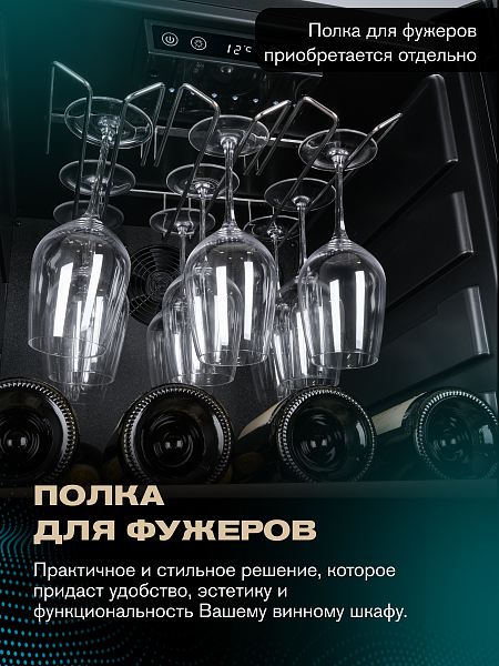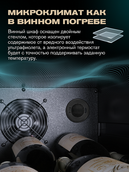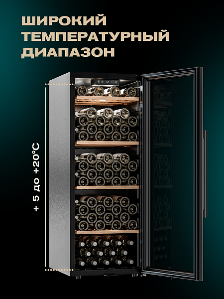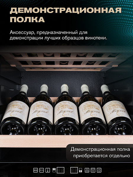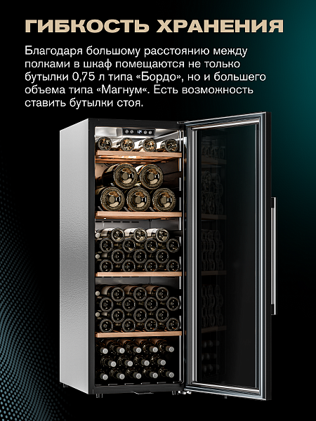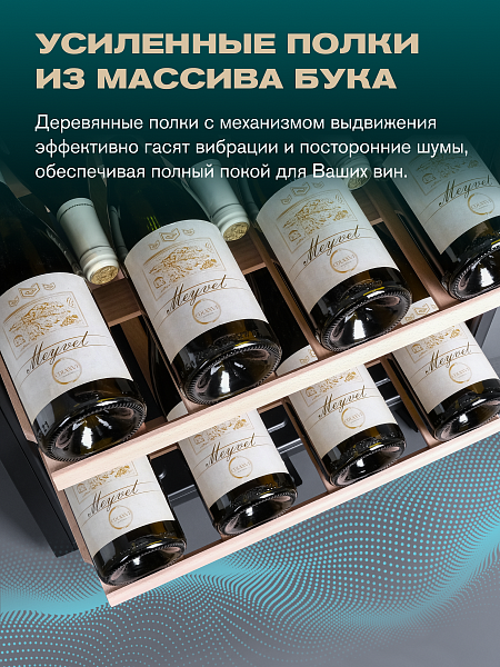 Модель оснащена четырьмя полками из дерева, что не только выглядит стильно, но и способствует правильной циркуляции воздуха внутри шкафа. Дополнительно можно установить до 6 полок, а также приобрести демонстрационную полку и полку для фужеров. Двойное стекло с УФ-фильтром надежно защищает вино от вредного воздействия света, что сохраняет его уникальный вкус и аромат.