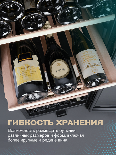 Meyvel MV105-KBF1 — отдельностоящее устройство, поэтому можно разместить его в любом удобном месте ресторана, отеля, бара или домашней винной комнаты без встраивания в мебель. Это удобно не только для создания стиля и атмосферы в интерьере, но и для предоставления легкого доступа к винам.